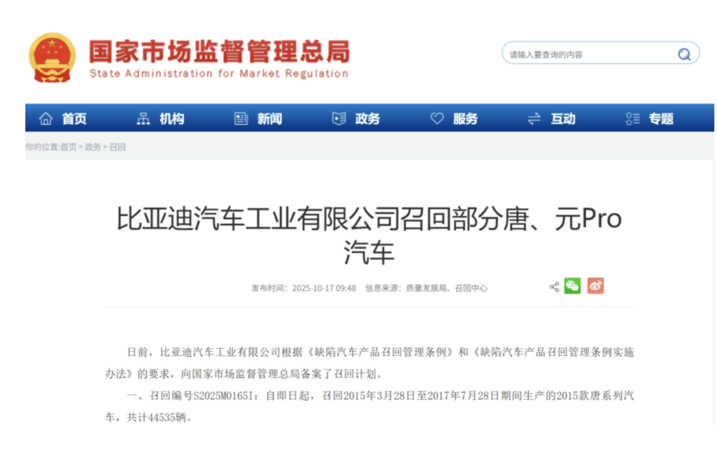 Effective immediately, a total of 44,535 units of the 2015 Tang series vehicles, produced between March 28, 2015, and July 28, 2017, will be recalled.