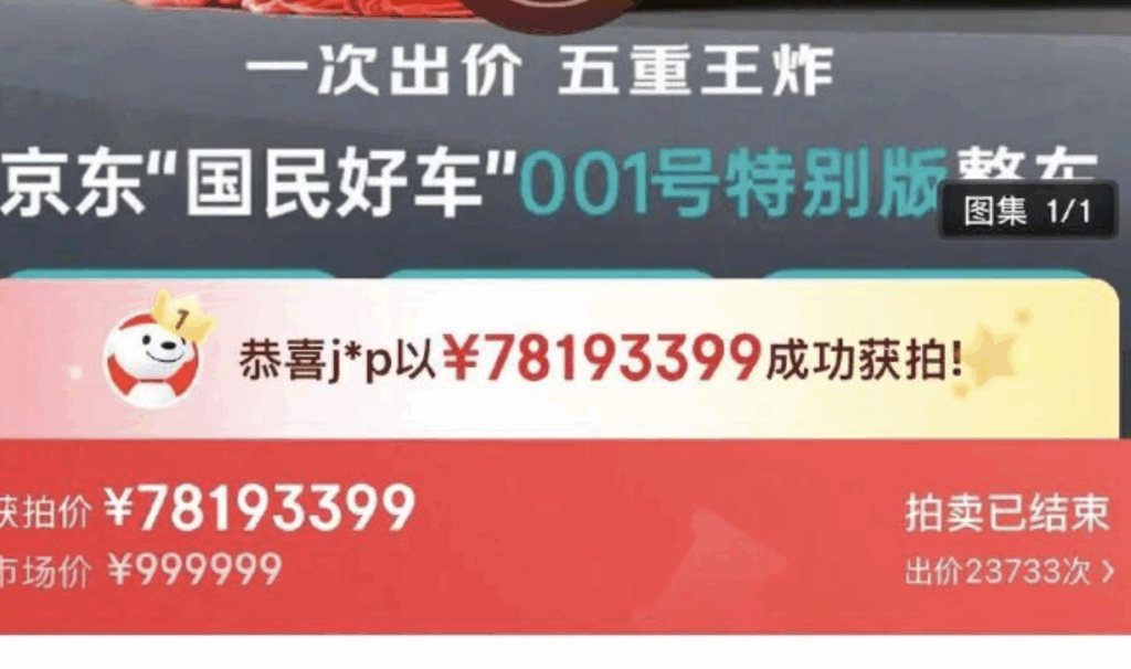 On the evening of October 22, JD.com’s “National Car” No. 001 was sold for an astronomical price of 78.19 million yuan on JD.com’s auction platform, sparking widespread industry discussion. According to reports, the “National Car” No. 001 recently launched on JD’s “JD Auction” channel, with the auction opening for online reservations on October 17 and officially starting on October 22 at 14:00.