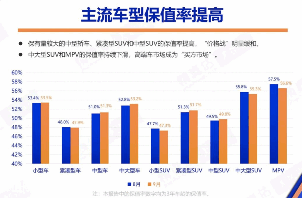 According to the report, MPVs continued to have the highest three-year value retention rate among all segments at 56.6%, though it fell by 0.9% from August. Mid-to-large SUVs ranked second at 55.3%, down 0.5% month-on-month. Compact cars and small SUVs also saw slight decreases of 0.1% and 0.4%, with retention rates of 47.9% and 47.3%, respectively.